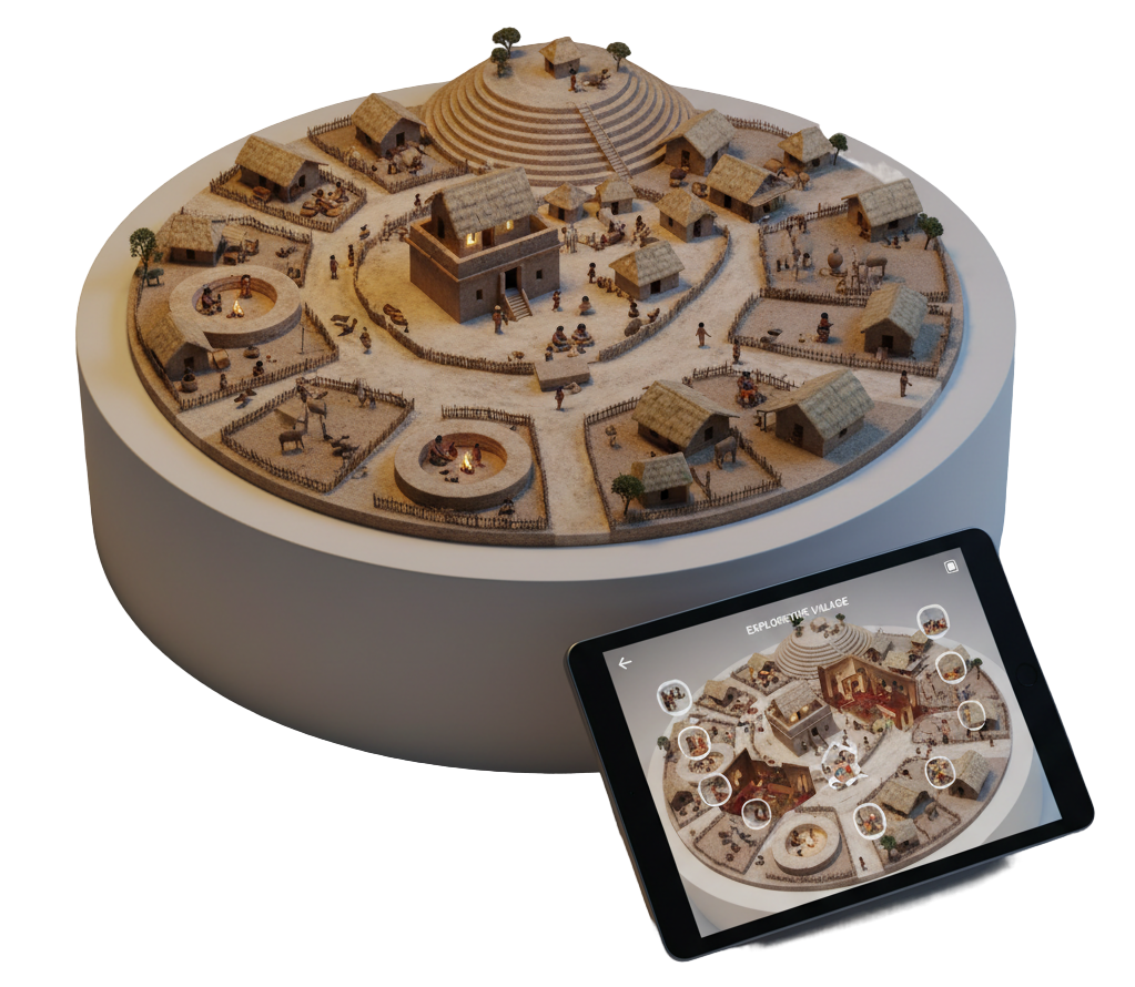 Макет деревни/городища с домами, хозяйственными постройками, фигурками людей и животных. Динамическая подсветка имитирует смену дня и ночи. Через AR-планшет можно «войти» в любую избу и рассмотреть интерьер.
