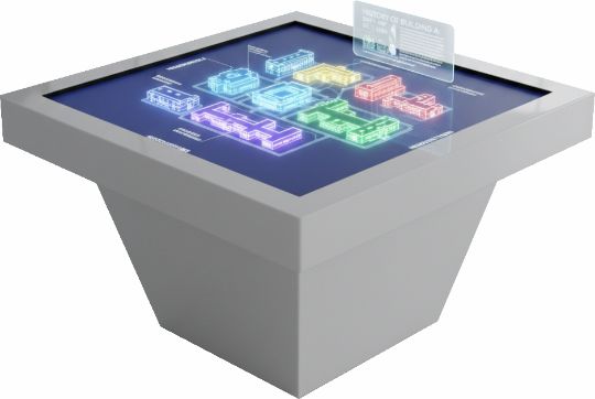 Архитектурный макет здания и территории ведомства. Динамическая подсветка выделяет этапы застройки, функциональные зоны. Символ стабильности и роста.. Через AR-планшет можно «войти» в здание и рассмотреть интерьер.